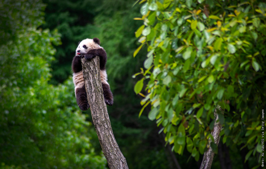 Гигантская панда взбирается на дерево на базе Шэньшупинга Китайского центра защиты и исследований гигантских панд