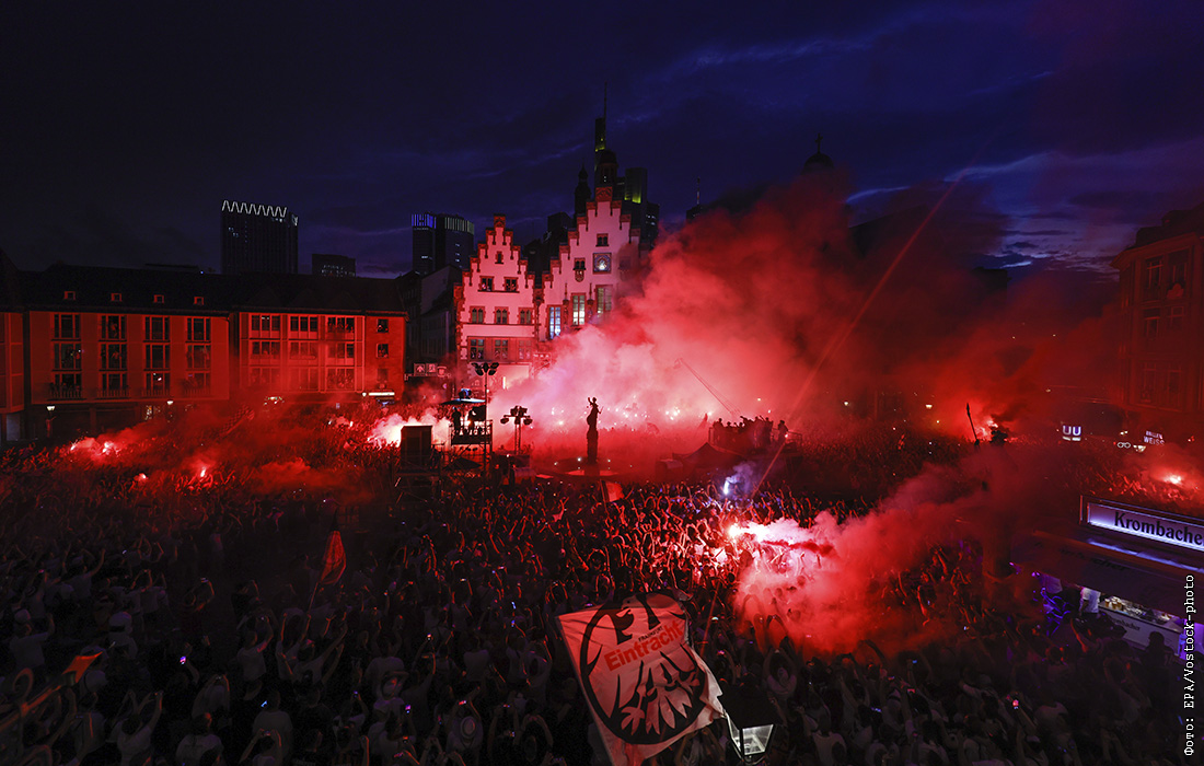 Болельщики ФК "Айнтрахт Франкфурт" празднуют победу в Лиге Европы УЕФА