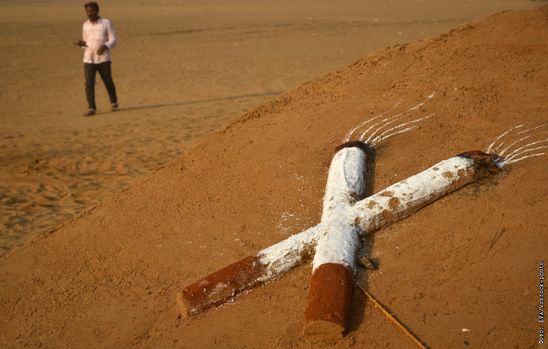 Песчаная скульптура, напоминающая о вреде курения, на пляже в индийском Ченнаи