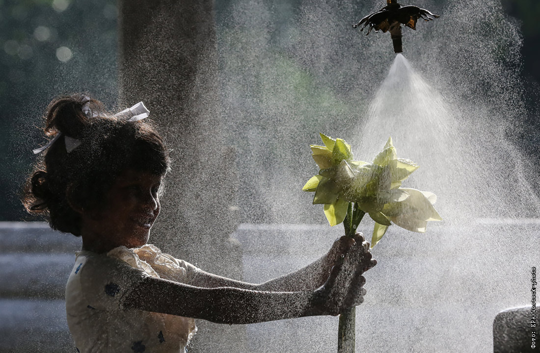 Девочка с цветами лотоса у фонтана. Коломбо, Шри-Ланка.