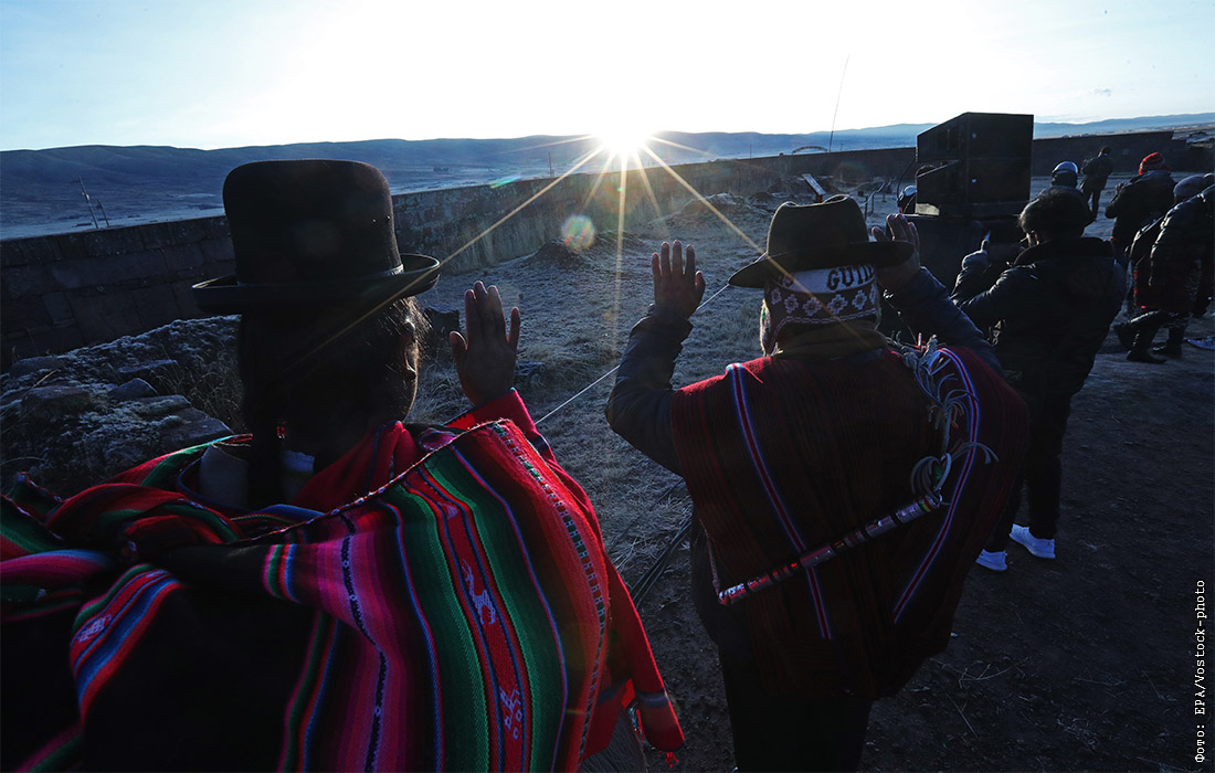 Индейцы аймара встречают первые лучи солнца в ожидании прихода нового года в Боливии
