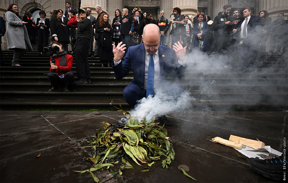 Ассамблея народов Виктории (аборигены Виктории) провела церемонию курения у здания парламента в Мельбурне