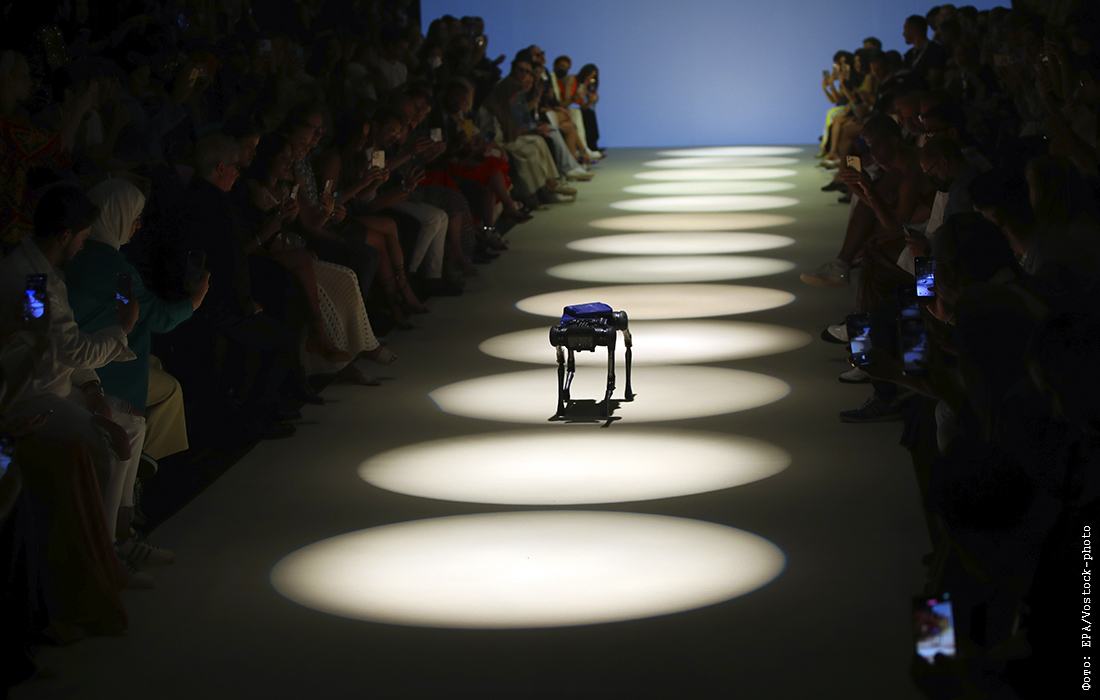 Первый в мире робот-собака в натуральную величину представляет сумку швейцарского бренда технических аксессуаров Ferronato во время Недели мужской арабской моды в Дубае