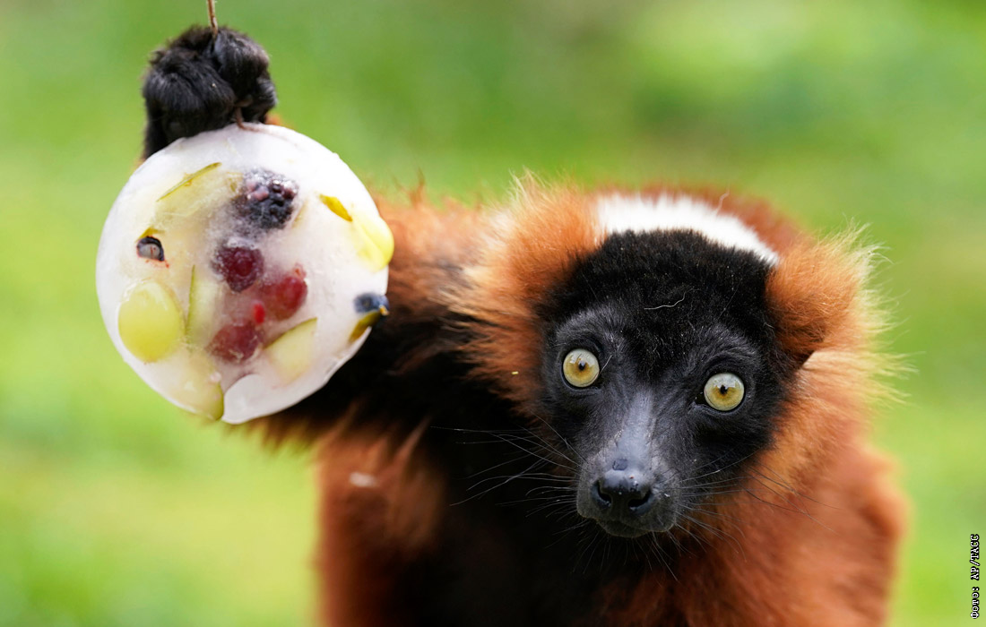 Лемур с замороженными фруктами в сафари-парке Блэр Драммонд в Шотландии