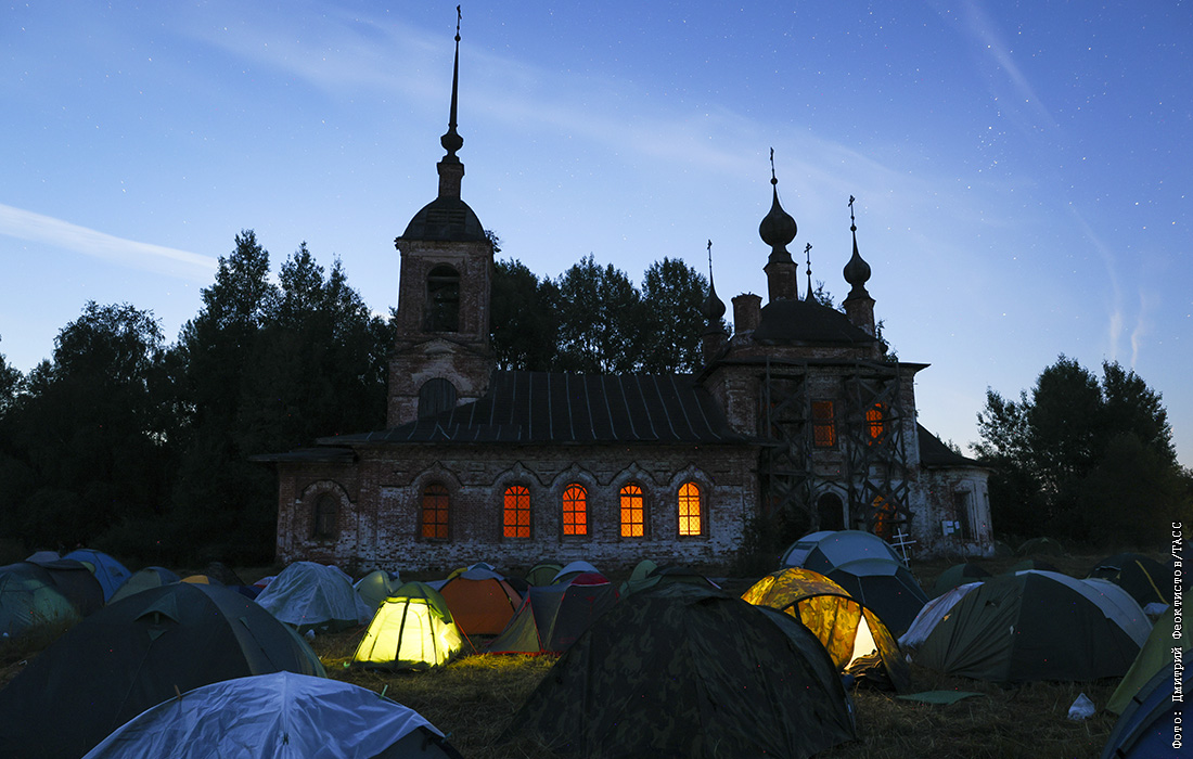 Палаточный лагерь участников Иринарховского крестного хода у храма Николая Чудотворца в селе Зубарево