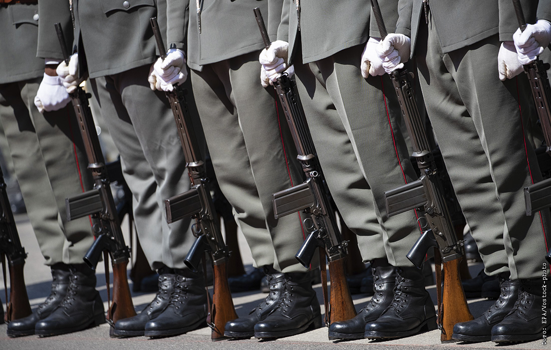 Члены австрийского почетного караула во время церемонии приветствия премьер-министра Венгрии Орбана в Вене