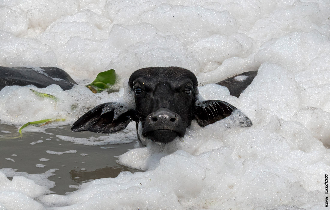 Река Ямуна, покрытая токсичной белой пеной в результате сброса промышленных отходов, в Нью-Дели