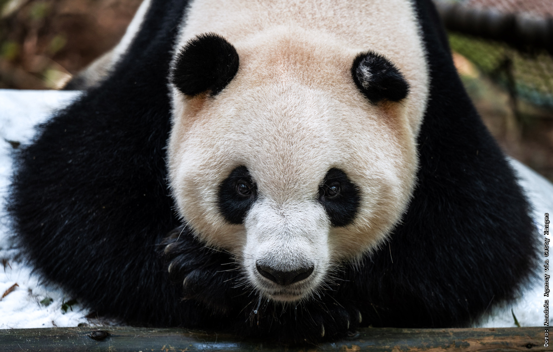 Панда лежит на льду в китайском зоопарке. В Гуанчжоу стоит жара, сотрудники зоопарка разными способами охлаждают животных.