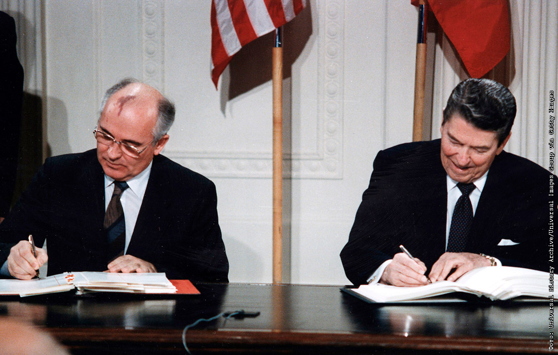 Президент США Рональд Рейган и генеральный секретарь СССР Михаил Горбачев подписывают Договор о ликвидации ракет средней и меньшей дальности в Восточной комнате Белого дома в 1987 году