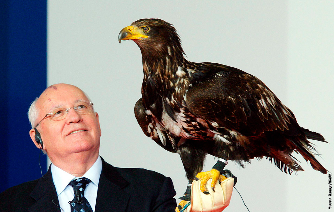 Михаил Горбачев держит орла на торжественной церемонии награждения Point Alpha Award в Гайзе в июне 2005 года
