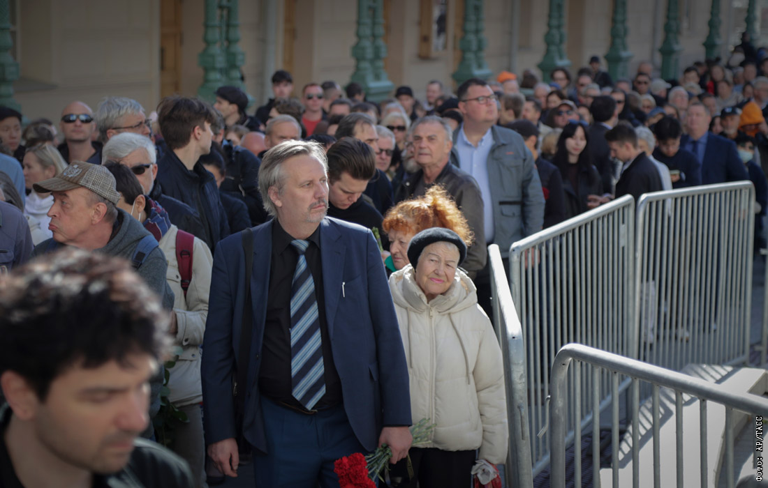 У входа выстроилась огромная очередь, сотни людей друг за другом проходят в зал с цветами