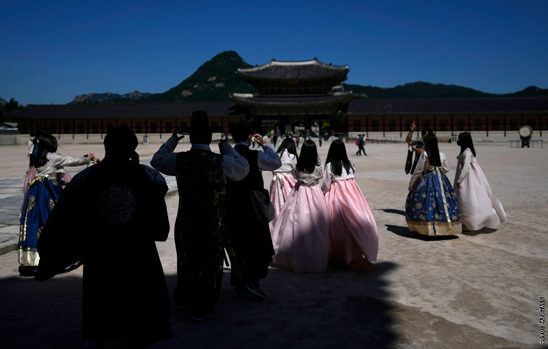 Жители Сеула гуляют по территории дворца Кёнбоккун