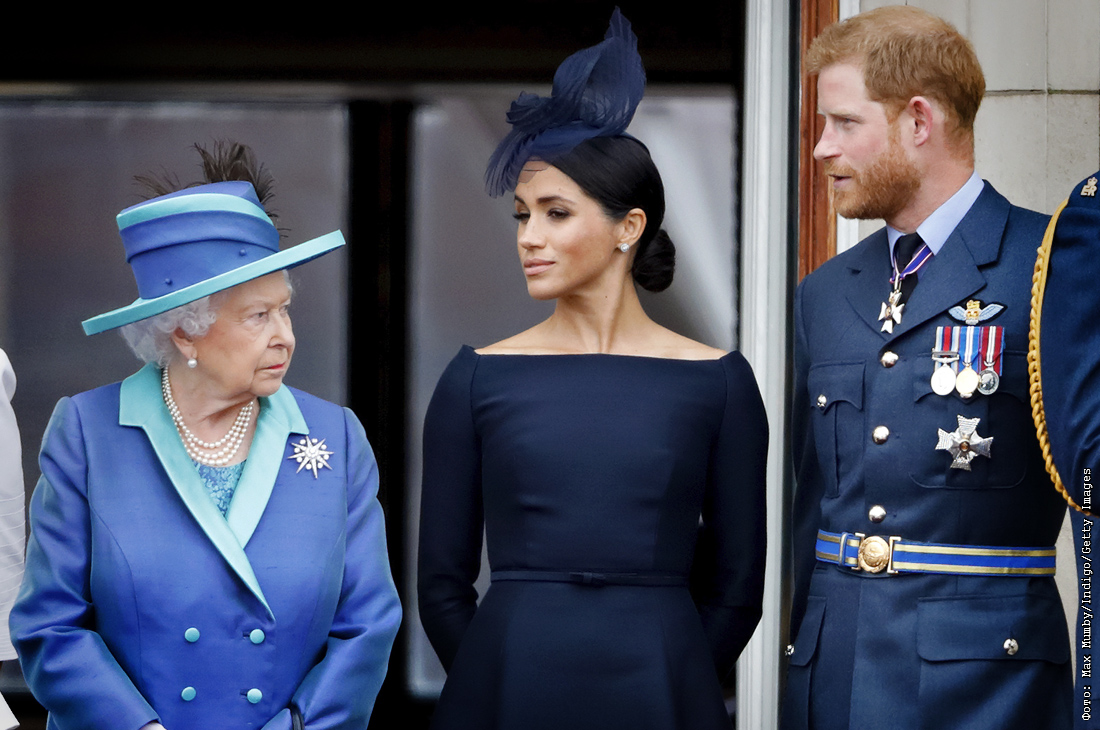 Королева Елизавета II, принц Гарри и его супруга Меган наблюдают за парадом в честь 100-летия Королевских ВВС. 2018 год.