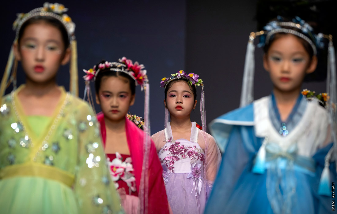 Модели представляют творения из линии детской одежды во время Китайской недели моды в Пекине