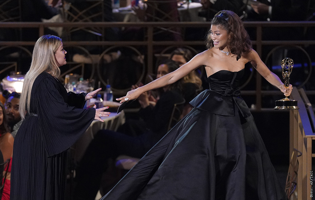 В Лос-Анджелесе прошла 74-я церемония вручения телевизионной премии "Эмми". На фото: певица Келли Кларксон и Зендея, получившая награду за лучшую женскую роль в сериале "Эйфория".