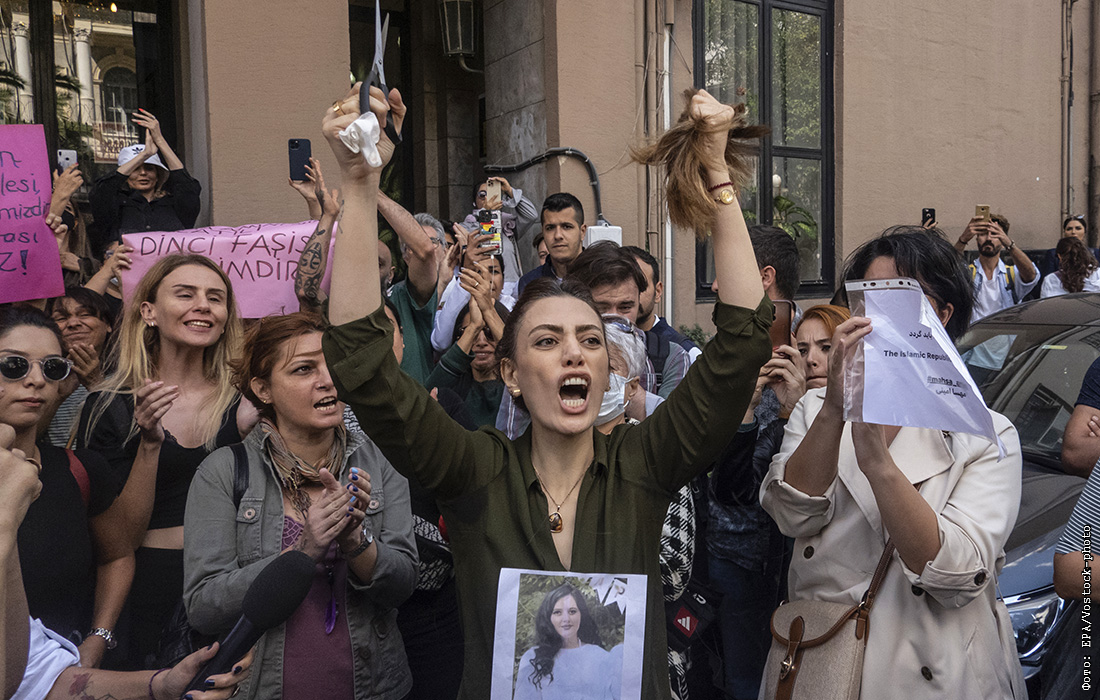 Акция протеста у консульства Ирана в Стамбуле после смерти 22-летней иранки Махсы Амини. Она была задержана в Тегеране 13 сентября полицией нравов за несоблюдение строгого дресс-кода для женщин. Девушка впала в кому, находясь под стражей, ее госпитализировали, 16 сентября стало известно о ее смерти.