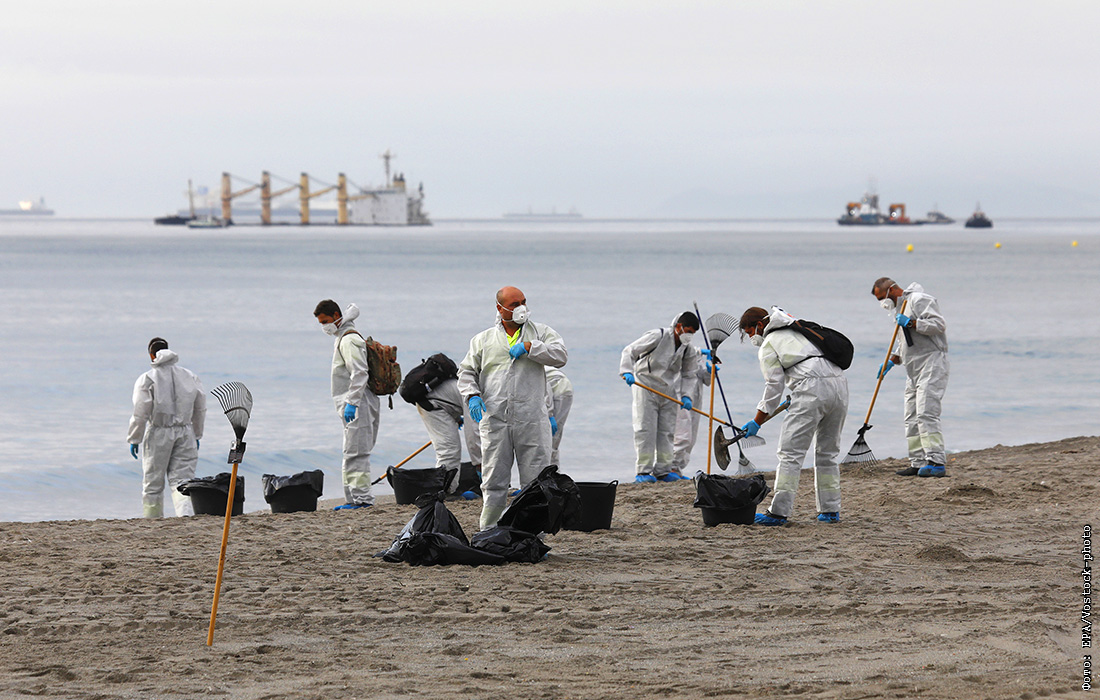 Муниципальные работники очищают пляж после разлива нефти с теплохода "ОС 35" в Испании