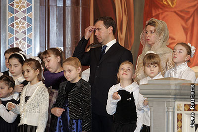Дмитрий и Светлана Медведевы на рождественской службе в храме Христа Спасителя в окружении воспитанников воскресной школы храма