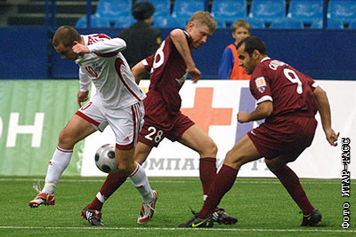 Игрок "Актобе" Марат Хайруллин и "Рубина" Сергей Нестеренко и Лаша Салуквадзе (слева направо) в матче международного футбольного турнира "Кубок Чемпионов содружества стран СНГ и Балтии": "Рубин" (Казань) – "Актобе" (Актюбе) - 0:2