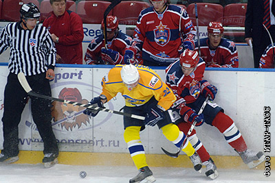 Игроки ЦСКА Максим Гончаров и "Химика" Денис Коротеев (справа налево) в матче чемпионата КХЛ: ЦСКА (Москва) – "Химик" (Московская область) - 4:2