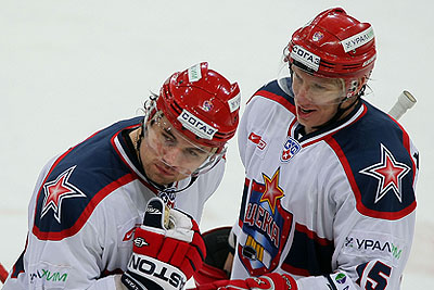 Армейцы Денис Куляш и Георгий Мишарин (слева направо) в матче чемпионата КХЛ: "Динамо" (Москва) - ЦСКА (Москва) – 2:1