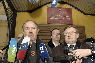 Адвокат Юрий Гервис, адвокат Евгения Чичваркина Владимир Жеребенков (на первом плане слева направо) и председатель исполкома партии "Правое дело" Андрей Дунаев после заседания Басманного суда, который вынес решение о заочном аресте Евгения Чичваркина