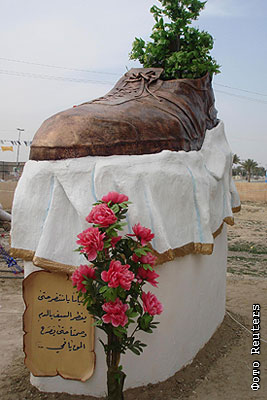 Памятник поставили в родном городе Саддама Хусейна - Тикрите. Автор монумента - багдадский скульптор Лайз аль-Амари. На открытии памятника он заявил, что журналист Мунтазер аз-Заиди, метнувший обувь в американского президента, стал народным героем как в мусульманском мире, так и за его пределами. Но при этом скульптор подчеркнул, что создание памятника не стоит рассматривать как политический шаг