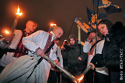 Представители Всеукраинского объединения "Свобода" на факельном шествии в честь годовщины боя под Крутами