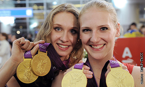 Российские синхронистки Наталья Ищенко и Светлана Ромашина (слева направо) в аэропорту "Шереметьево". Российская сборная по синхронному плаванию завоевала "золото" на ХХХ летних Олимпийских играх в Лондоне.