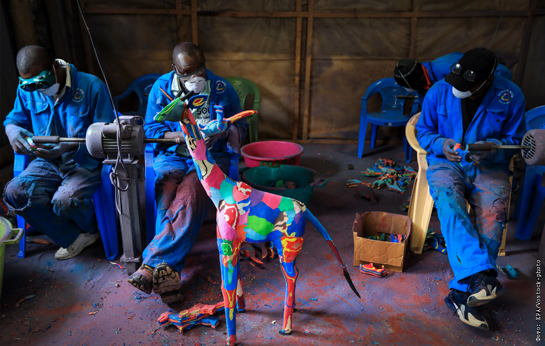 Сотрудники компании по переработке сырья "Ocean Sole" превращают старые вьетнамки, найденные на кенийском побережье, в произведения искусства