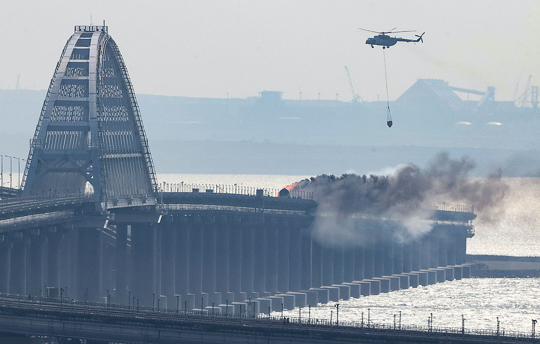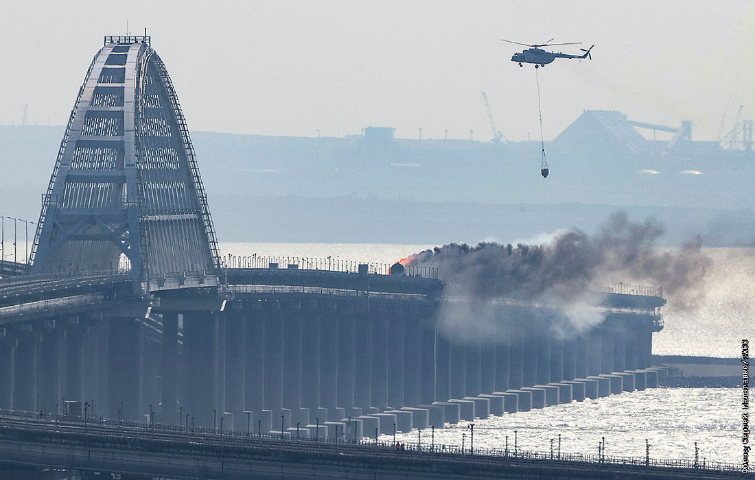 Утром 8 октября на автомобильной части Крымского моста взорвался грузовой автомобиль, в результате чего загорелись топливные цистерны железнодорожного состава. По данным властей Крыма, обрушены два пролета автомобильного полотна ветки, которая идет из Краснодара в Керчь. Одна автомобильная нитка - из Керчи на Тамань, предварительно, цела. Движение автомобилей и поездов по мосту было остановлено.