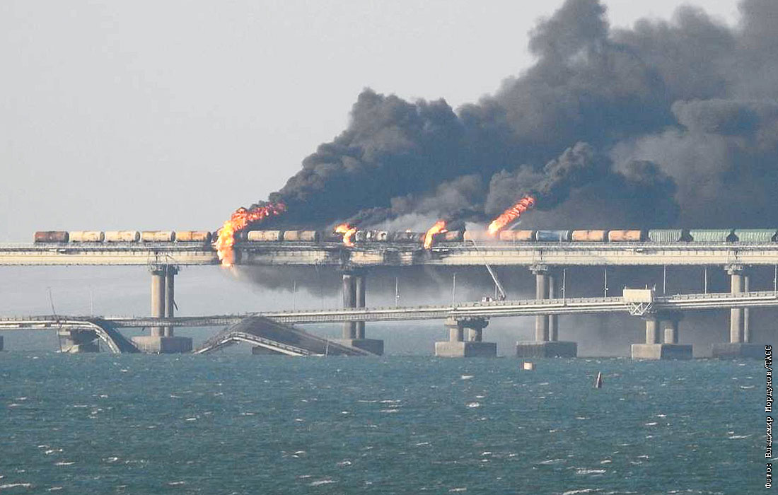 Утром 8 октября на автомобильной части Крымского моста взорвался грузовой автомобиль, в результате чего загорелись топливные цистерны железнодорожного состава. По данным властей Крыма, обрушены два пролета автомобильного полотна ветки, которая идет из Краснодара в Керчь. Одна автомобильная нитка - из Керчи на Тамань, предварительно, цела. Движение автомобилей и поездов по мосту было остановлено.