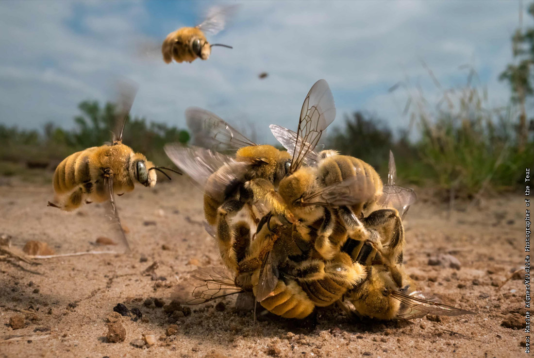 Победитель в номинациях "Лучший фотограф дикой природы - 2022" и "Поведение: беспозвоночные". Клубок кактусовых пчел кружится над горячим песком. Южный Техас, США.