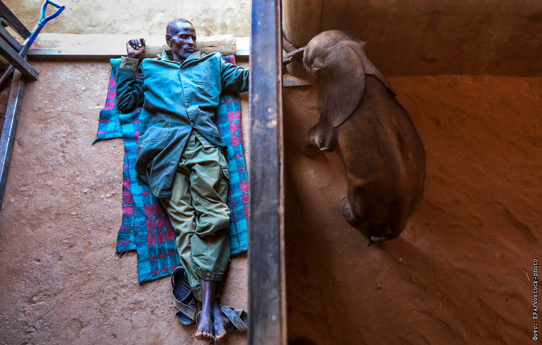 Недавно спасенный слоненок играет со сторожем в карантинной зоне заповедника Ретети в Самбуру, Кения
