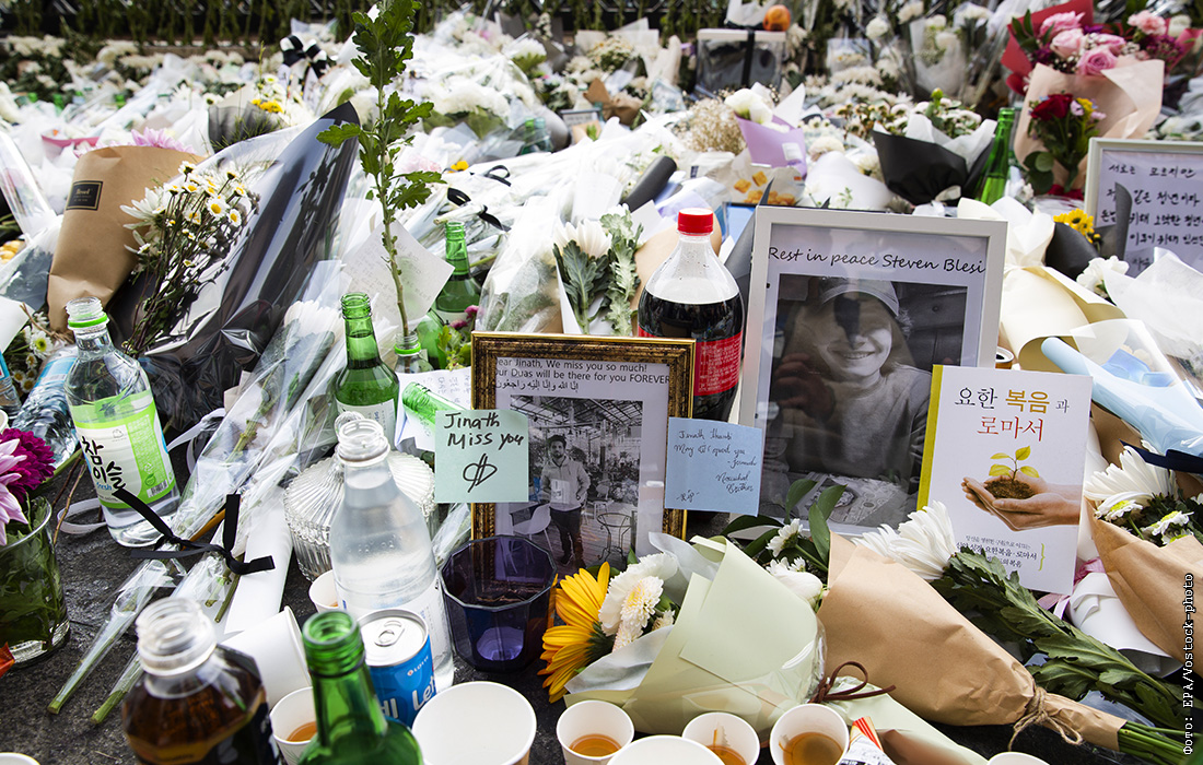 Стихийный мемориал в память о погибших в результате давки в центре Сеула