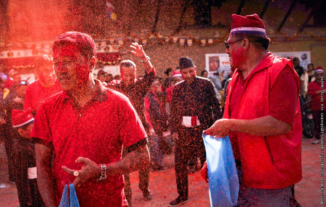 Жители Катманду обсыпают друг друга порошком ярко-красного цвета по случаю фестиваля Синдур Джатра