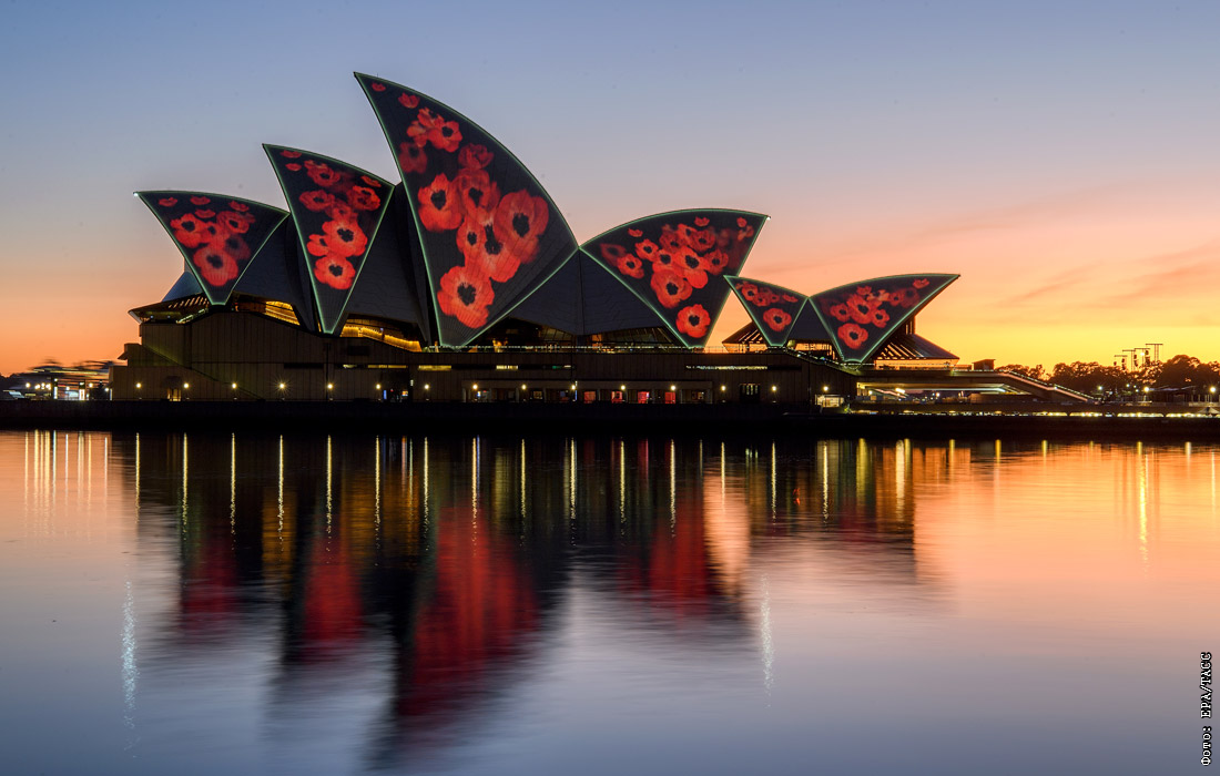День памяти павших в годовщину окончания Первой мировой войны отмечают в Австралии. На фото: проекция на Оперном театре в Сиднее.