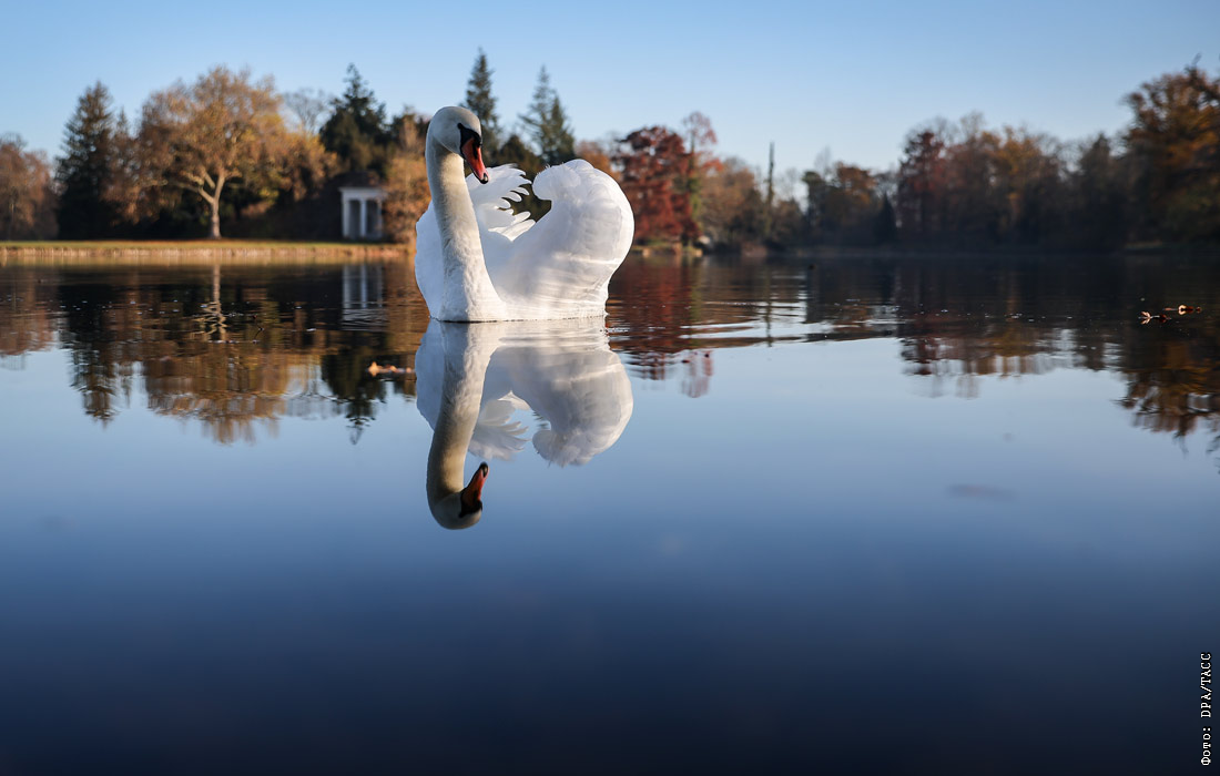 Лебеди в парковом комплексе замка Верлиц в Германии