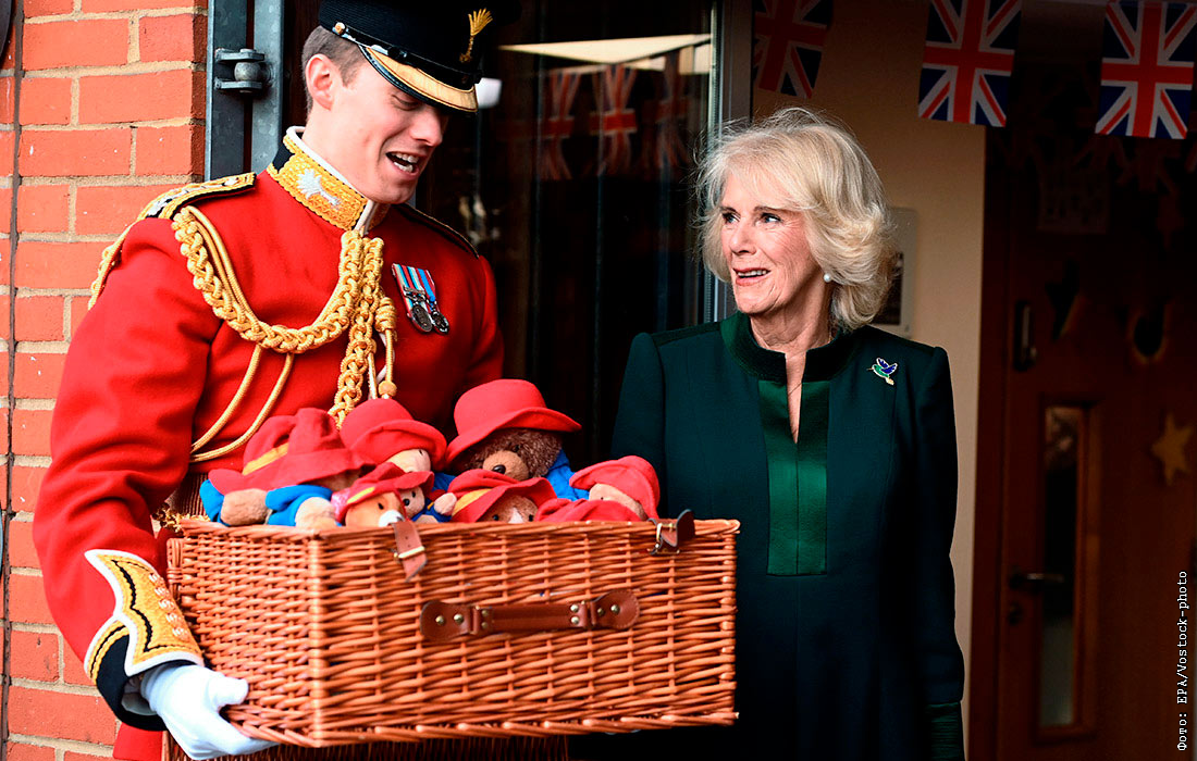 Британская королева-консорт Камилла посещает питомник Барнардо в Лондоне. Камилла принесла в ясли для детей корзину с мишками Паддингтон.
