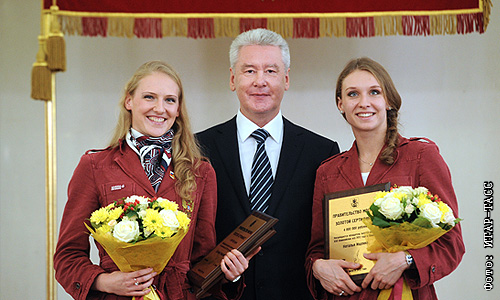 Сергей Собянин и российские синхронистки Светлана Ромашина и Наталья Ищенко (слева направо) на церемонии вручения премий победителям и призерам Олимпийских игр 2012 в Лондоне.