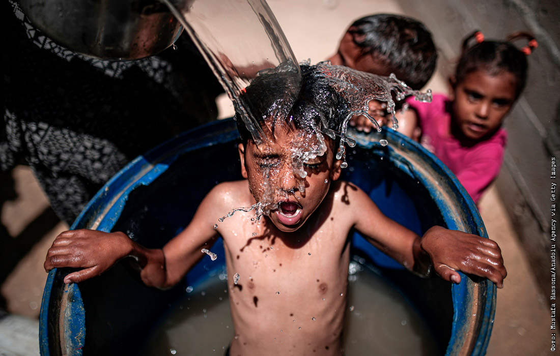 Дети охлаждаются во время жары в Газе
