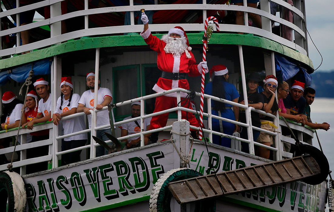 Санта на лодке прибыл в столицу бразильского штата Амазонас - Манаус