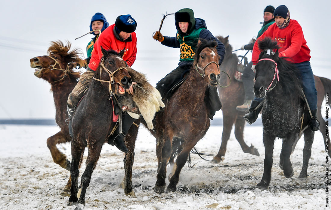 В Китае прошли соревнования по кок-бору. Кок-бору - это вид спорта с элементами скачек и игры. Всадники борются за тушу козла, которую необходимо забросить в ворота команды соперника.