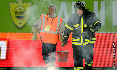 Тушение файеров, брошенных болельщиками на футбольное поле, во время матча Лиги Европы по футболу: "Анжи" (Махачкала, Россия) - "АЗ Алкмар" (Алкмар, Нидерланды) – 1:0.