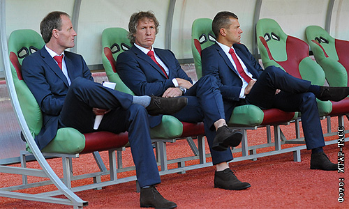 Главный тренер ФК "АЗ Алкмар" Гертьян Вербек (в центре) на матче Лиги Европы по футболу: "Анжи" (Махачкала, Россия) - "АЗ Алкмар" (Алкмар, Нидерланды).