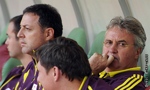 Главный тренер ФК "Анжи" Гус Хиддинк на матче Лиги Европы по футболу: "Анжи" (Махачкала, Россия) - "АЗ Алкмар" (Алкмар, Нидерланды).