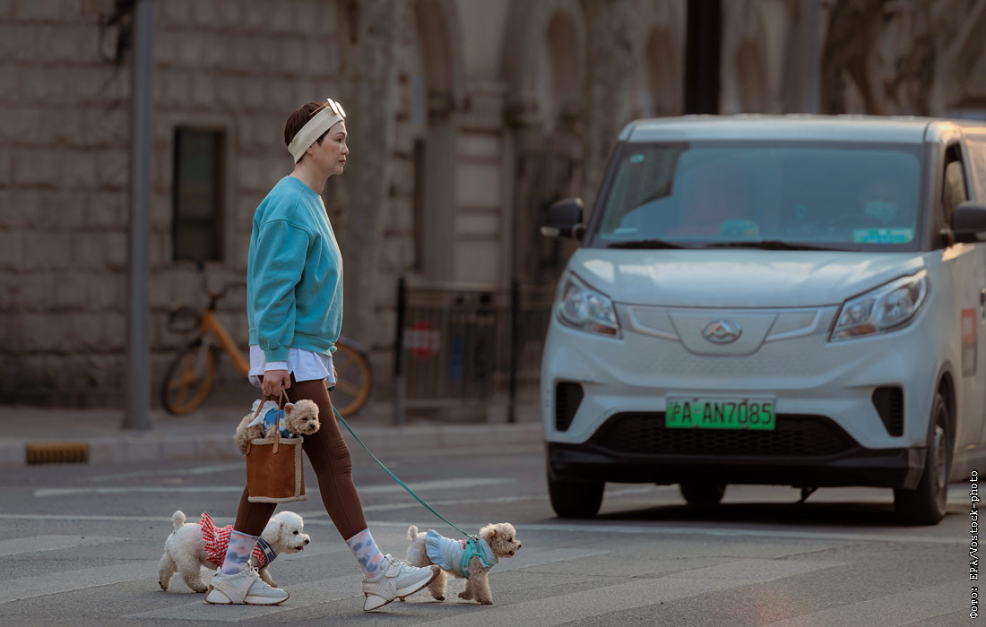 Женщина выгуливает собак в Шанхае