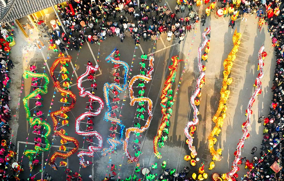Жители деревни исполняют танец дракона в китайском Тайчжоу
