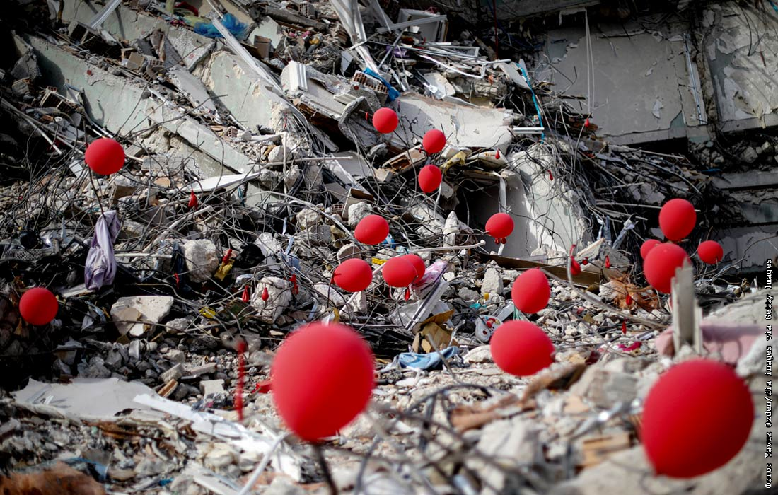 Красные воздушные шары в память о детях, погибших в результате землетрясения в Хатае, Турция