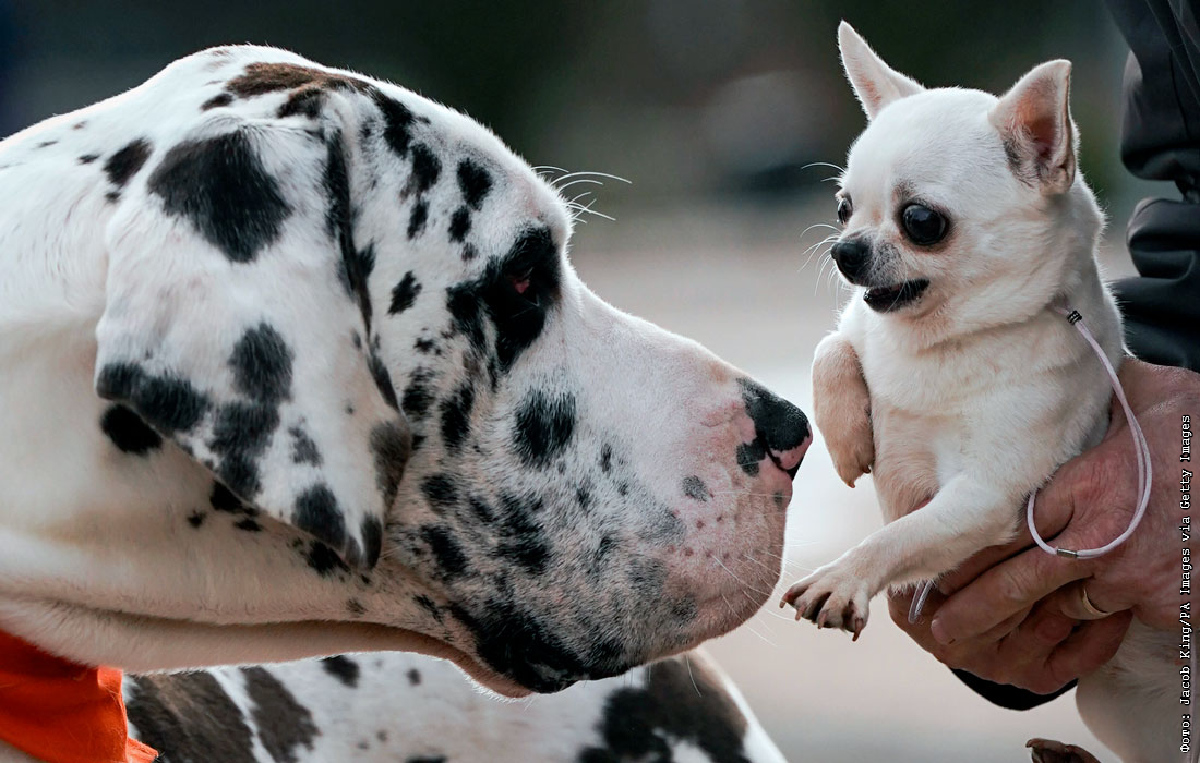 Датский дог и чихуахуа во время фотосессии в Национальном выставочном центре в Бирмингеме